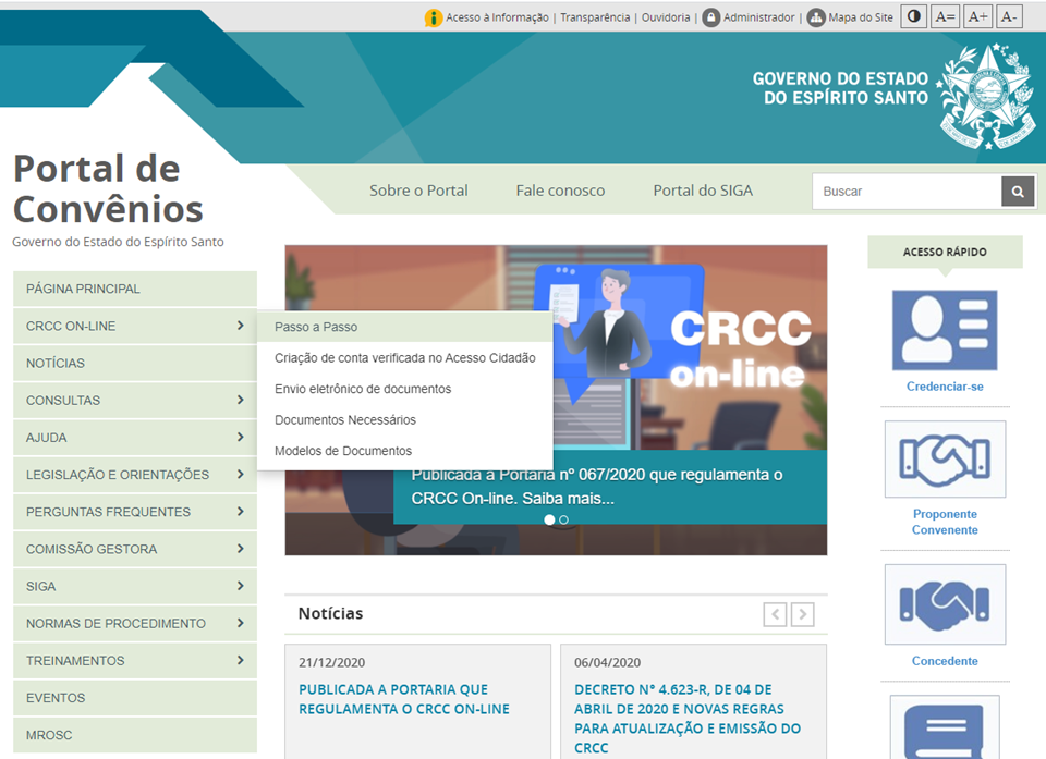 A partir de 1º de janeiro de 2021, esse procedimento será realizado exclusivamente de forma eletrônica, por meio de uma nova plataforma disponível no Portal de Convênios do Estado – www.convenios.es.gov.br. As instruções estão disponíveis no referido site, no menu “CRCC On-line”.