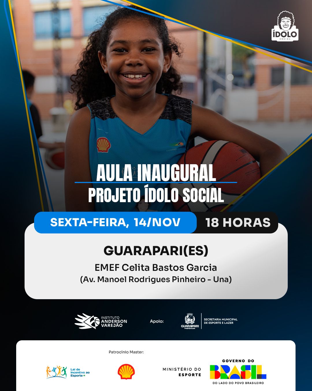 Guarapari passa a integrar, a partir desta semana, o Projeto Ídolo Social, uma iniciativa do Instituto Anderson Varejão que une esporte, educação e valores para transformar a vida de crianças e adolescentes por meio do basquete. O projeto chega à cidade com o apoio da Prefeitura de Guarapari e vai oferecer aulas gratuitas para meninas e meninos de 7 a 16 anos.