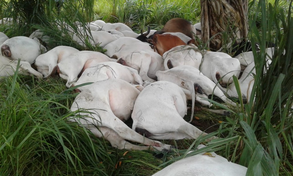 Um raio que caiu em Poconé, a 103 Km de Cuiabá, matou 44 novilhas em uma fazenda da região. na hora do raio os animais estavam aglomerados embaixo de uma figueira e foram atingidos. As informações são do G1.