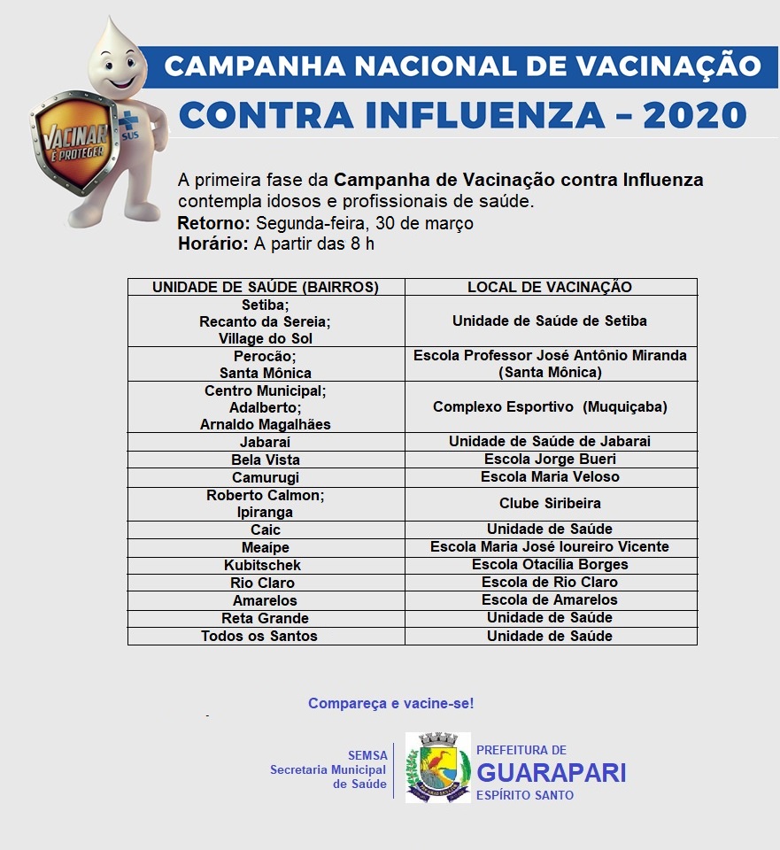 Foi retomada nesta segunda-feira (30) a primeira fase da Campanha Nacional de Vacinação Contra a Gripe (Influenza). Neste primeiro momento estão sendo atendidos somente os idosos e os profissionais da saúde.