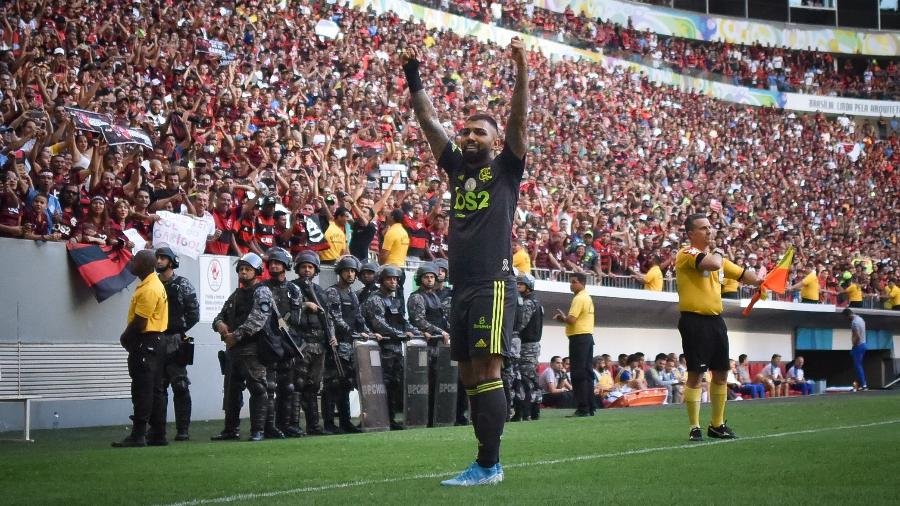 Gabigol comemora gol do Flamengo contra o Avaí, no Mané Garrincha, pelo Brasileiro. Catarinenses venderam mando neste jogo
