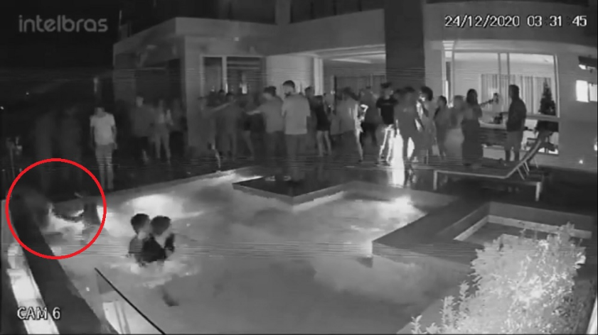 As imagens de uma câmera de segurança do condomínio mostram o  empresário Luiz Henrique Cavalcanti Romano sendo agredido por outros rapazes. Na sequência, o grupo cai na piscina e as agressões continuam, até que a vítima tenta sair da piscina e é empurrada.