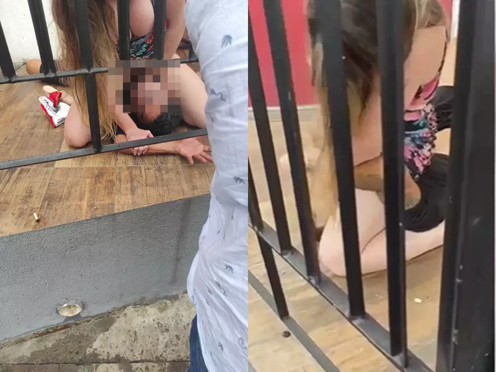 A mulher, revoltada com a tentativa de roubo, chega a desferir socos no homem, que continua no chão sem conseguir sair da imobilização.